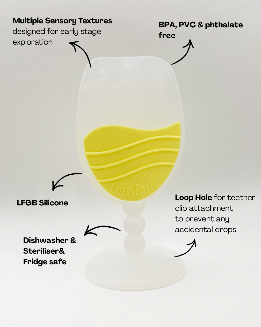 A smooth, design-led silicone teether shaped with gentle textures and the Cheers Baby Co. signature three-bubble stem for steady gripping. Lightweight and durable, it supports everyday soothing and encourages simple sensory engagement.